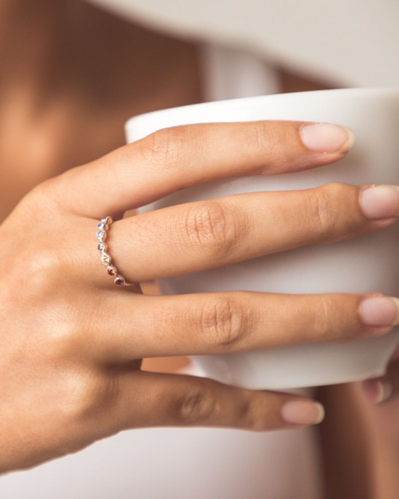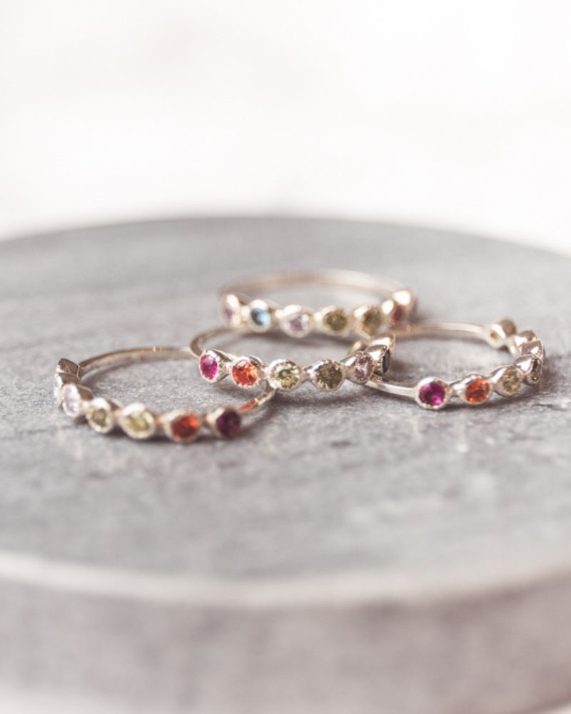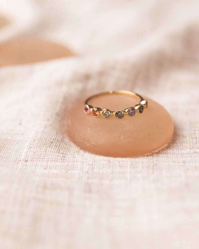 Esta sortija combina el colorido de los chakras con sus propios beneficios. Las 7 Zirconitas de 3 mm cada uno están alineadas a lo largo de la sortija de forma sencilla y delicada.